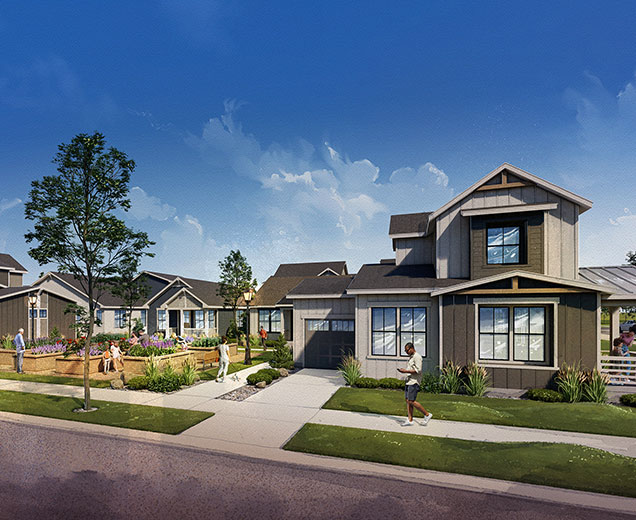 These floor plans have been thoughtfully designed to deliver custom-home quality without the typical stress and time required for a custom build. These for-sale homes range in size from 1,990 to 2,790 square feet and are an easy walk to parks, schools, and The Village Square.