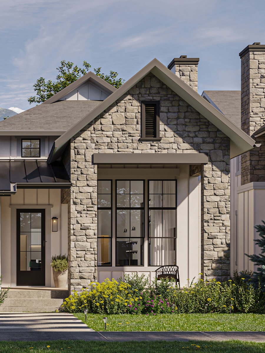 Multi-family residences patterned after classic Montana manor homes, each with its own entrance and garage.